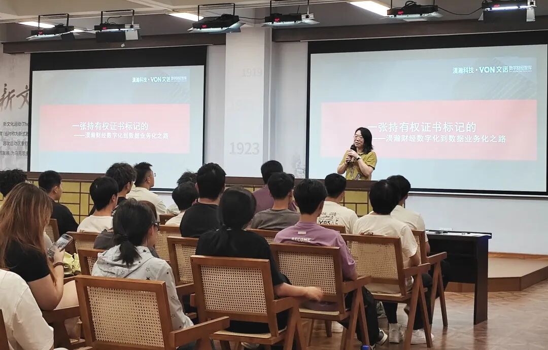 在第一阶段的“数智讲座”环节,毛总给在场的大学生们作《一张持有权证书标记的——淏瀚财经数字化到数据业务化之路》的主题分享,围绕着我司发展历程、主营业务及变革升级等展开讲座。